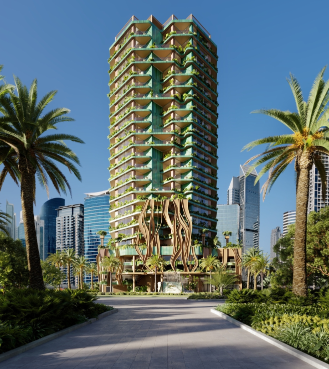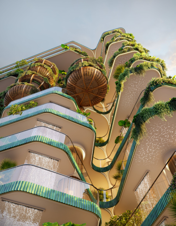 Eywa(エイワ)は、映画「アバター」に登場する「ハレルヤ・マウンテン」と、シンボリックなバニヤンツリーをモチーフにした超高級レジデンスで、「命の木(Tree of Life)」を具現化した建築コンセプトを採用しています。有機的な枝と根がうねるような外観デザインと、豊富な緑と水、クリスタルを組み合わせた"生きている建物"として、永続的な成長と英知を象徴するのが特徴です。 建物全体は「Air(空気)」「Water(水)」「Tree(木)」「Stone(石)」「Fire(火)」という5つのエレメントに基づき設計されており、各エレメントに対応した空間演出とマテリアルが共用部と各住戸に組み込まれています。メインホールの7.5mの吹き抜け、レストラン等の4.4m天井、各アパートメント約3.4mの天井高に加え、特殊フィルターによる空気清浄と天然アロマが導入され、常に澄んだ空気環境を提供します。 エントランスには迫力あるウォーターフォールが設置され、一部住戸には専用の滝が用意されるほか、1階テラスには4つのスイミングプールが配置され、各アパートメントには約2×3mのプライベートプールが備わります。 建物自体が一本の巨大なバニヤンツリーのようにデザインされ、各住戸には空中庭園や豊かな植栽が配され、共用部も内外にわたり多くの樹木とガーデンで構成されています。 内部外部の床・壁には天然石を多用し、建物全体には高さ約105mに及ぶクリスタルの"エナジーピラミッド"が貫くように設計され、パブリックエリアには浮遊する日本式ストーンガーデンやクリスタルガーデンが点在します。メインホール内の暖炉や、1階テラスおよびレストラン、クラブハウスに設けられたオープンファイアの"トライバルミーティングプレイス"が、コミュニティの集いと精神性を象徴します。