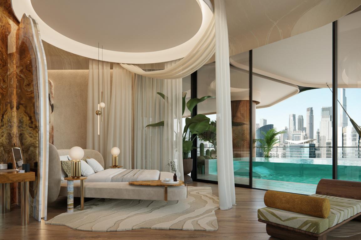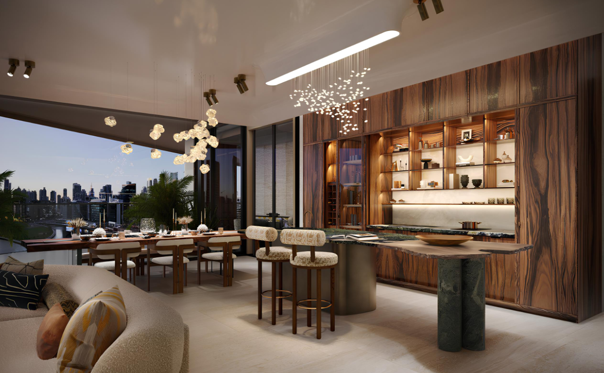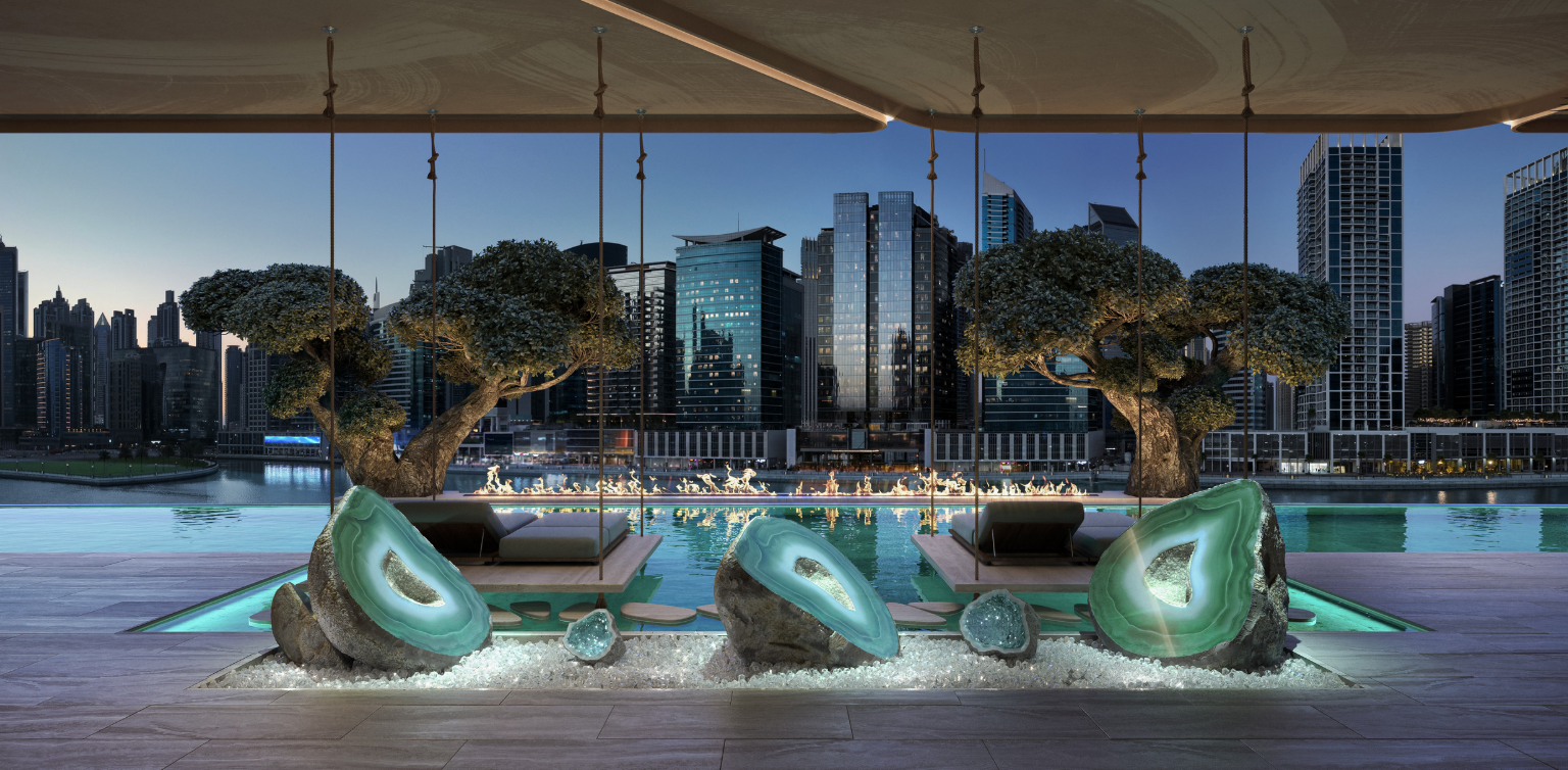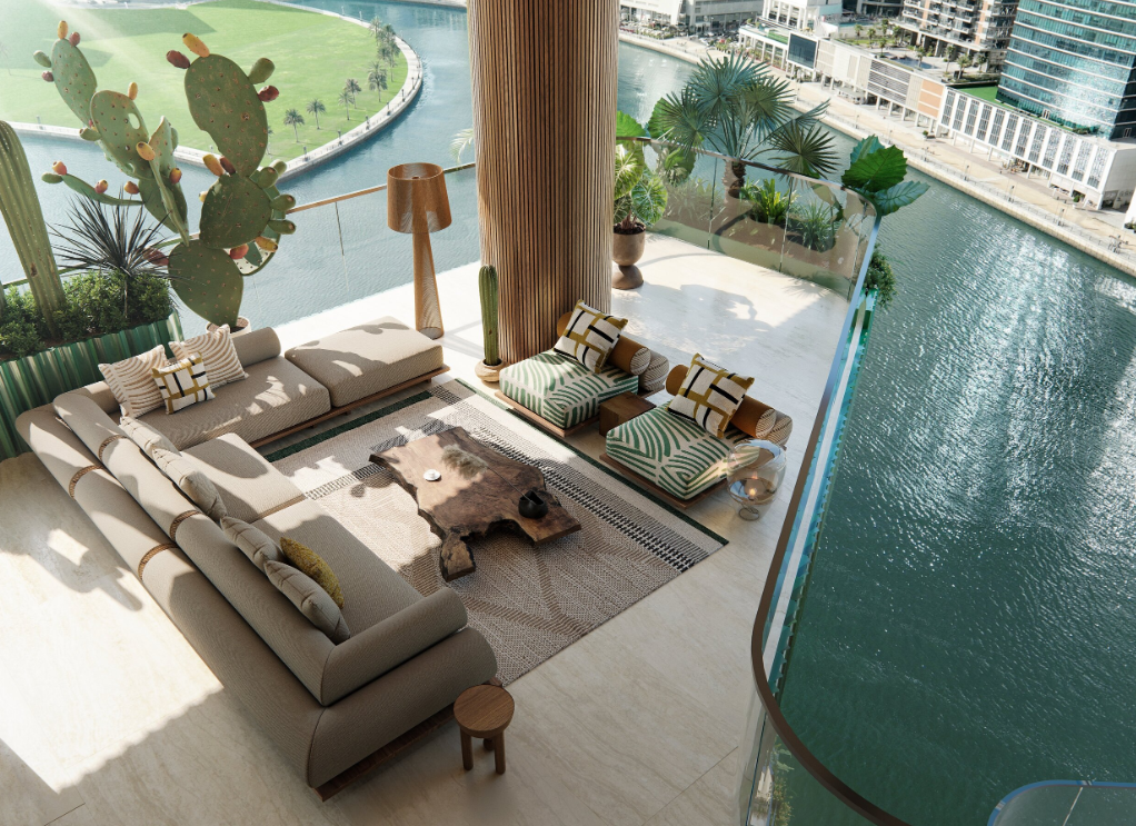 自然素材をふんだんに使用したラグジュアリーな内装仕上げ。ドバイウォーターカナルのラグーンとドバイスカイラインを見渡す壮大なビュー。すべてのアパートメントにプライベートテラス+プールを設置。一部住戸には専用ウォーターフォール(滝)を採用。住戸内のクリスタル配置等について、ヴァーストゥ・シャーストラ(Vastu Shastra)の専門家推奨に基づくデザイン提案。 キッチン:世界有数のブランドによるショーキッチンを採用し、デザイン性と機能性を両立。 造り付けのエクスクルーシブなワードローブ(In-built exclusive wardrobes)。高級仕様のバスルームフィッティング(Exquisite furnished bathrooms)。