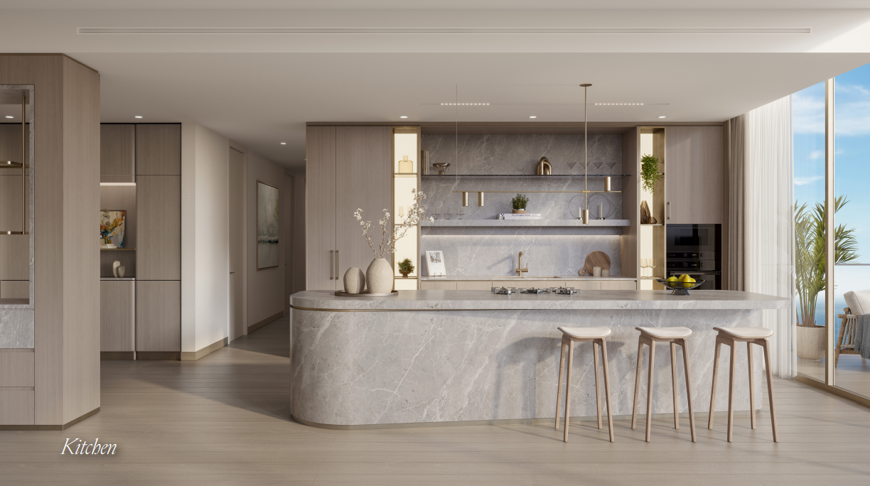 全ユニットに最新のヨーロッパ製高級家電が完備されています。ボッシュやシーメンスのビルトイン型家電セット一式が標準装備で、電気オーブン、IHクッキングヒーター、プッシュプル式レンジフード、大型冷蔵庫、全自動食器洗い機が含まれます。調理台はカラカッタマーブルまたはエンジニアリングクォーツで造られており、広い作業面積と耐久性を兼ね備えています。キャビネットはドイツ製の高品質ラッカー仕上げで、ソフトクローズ機構と棚収納が装備されています。照明はLEDダウンライトとペンダント照明の組み合わせで、料理をしやすい環境です。水栓はタッチレスセンサー付きで、使いやすく衛生的です。